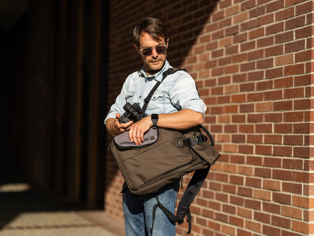 - Long shoulder straps with daisy chain and reinforced camera clip attachments