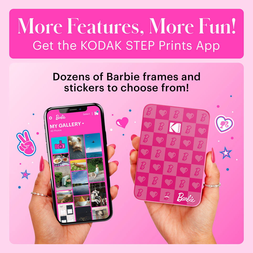 BARBIE X KODAK ICONIC AND STYLISH Step into a world of glamour with the Barbie and Kodak. This chic lightweight pocket-sized printer prints up to 25 photos on a single charge.