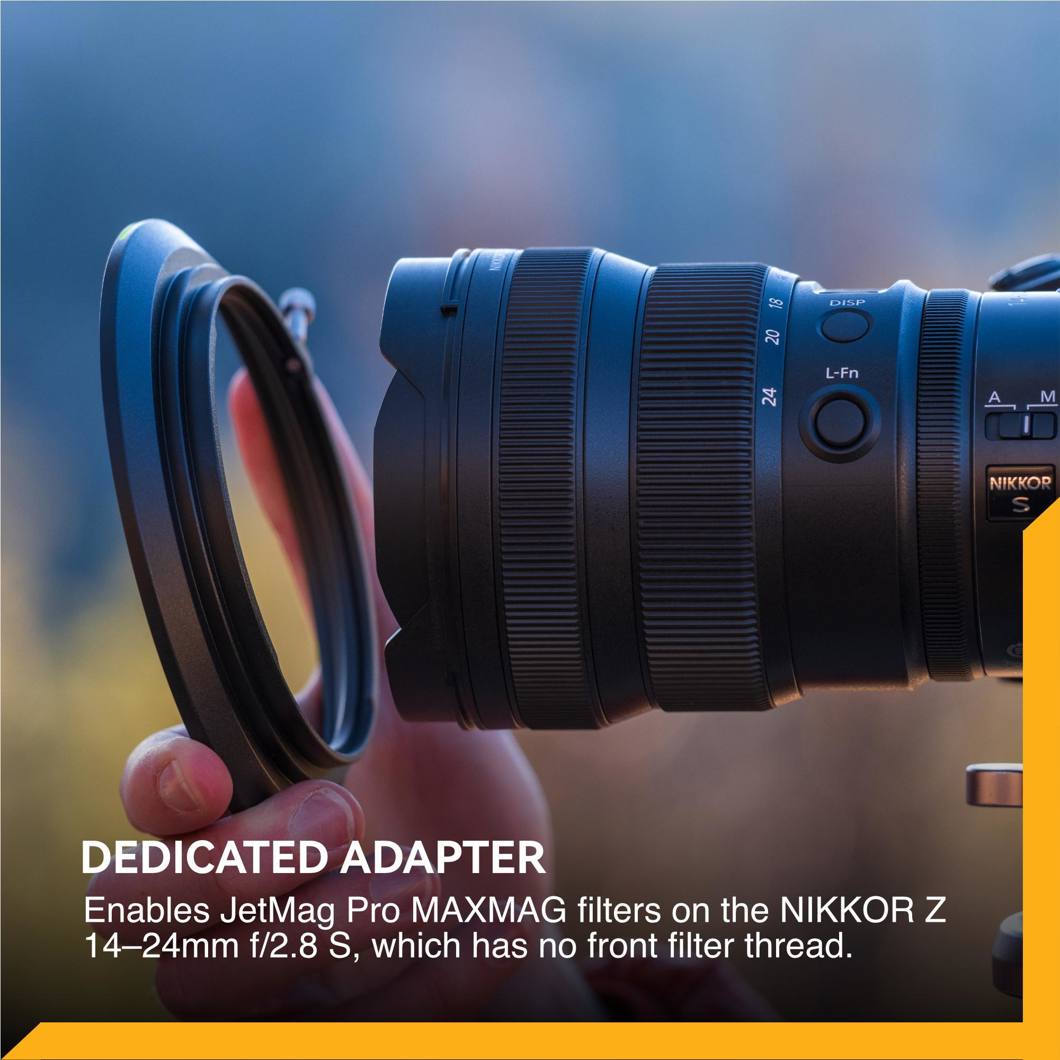 Enables JetMag Pro MAXMAG filters on the Nikkor Z 14-24mm F2.8 S, which has no front filter thread. Engineered with ultra compact design and will maintain clean edges, even on ultra-wide lenses.
