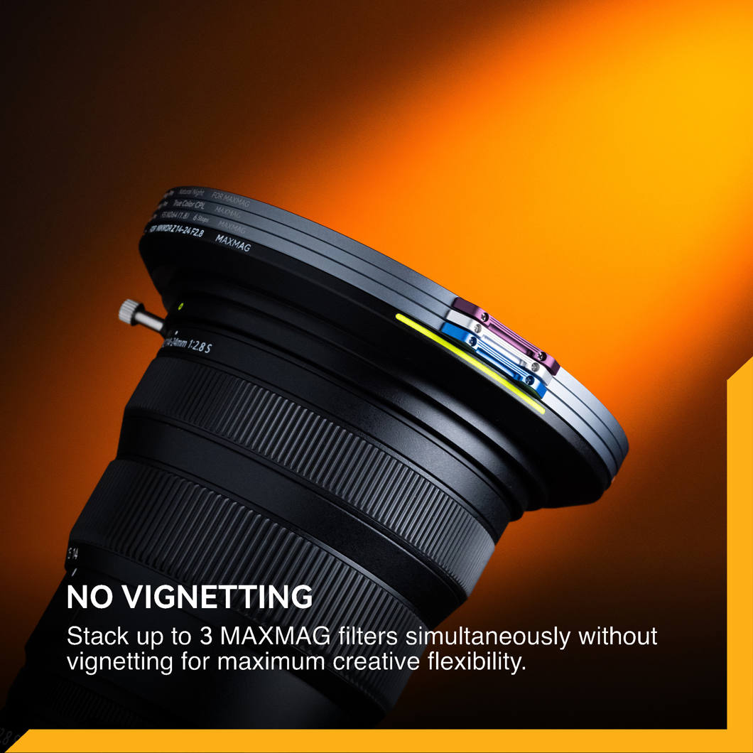 Stack up to 3 MAXMAG filters simultaneously without vignetting for maximum creative flexibility. (Nikkor Z14-24mm F2.8 holder)