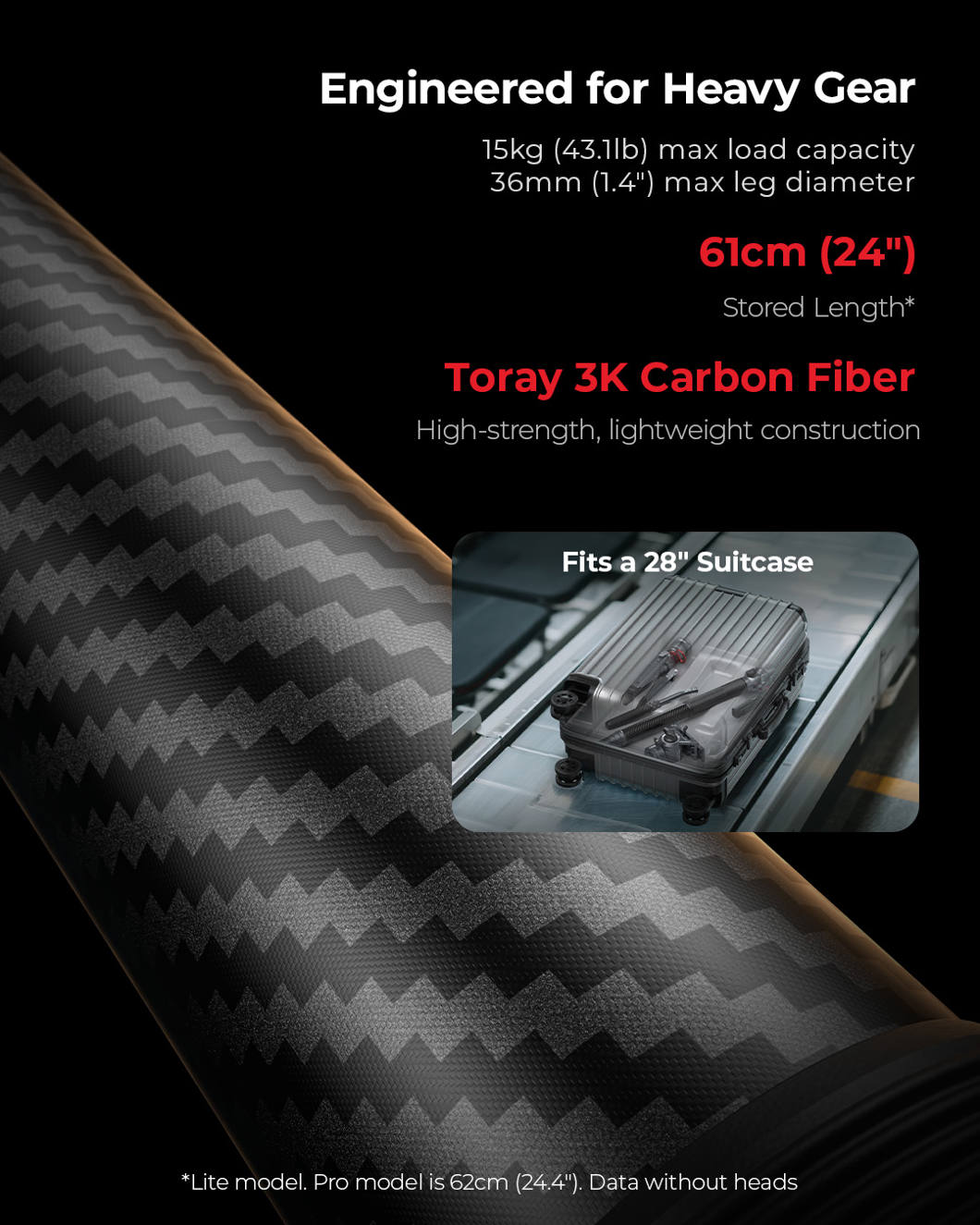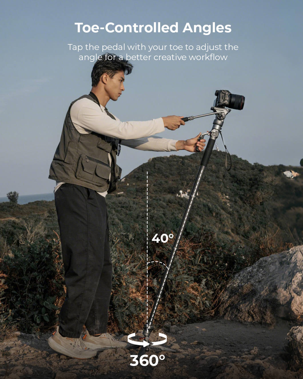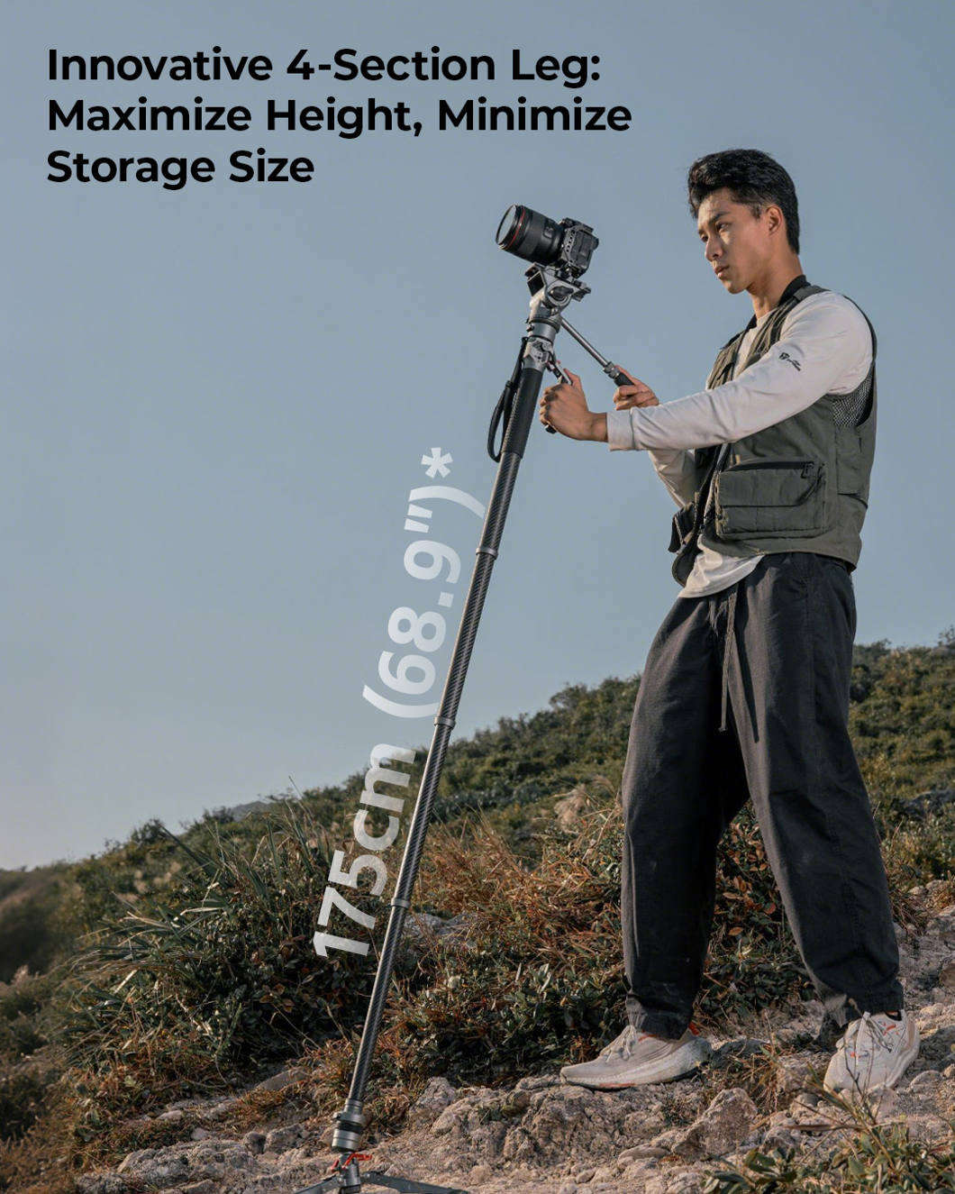 Monopodissa on kompakti nestepää, jossa on 3 kg:n tasapainotettu palautusvoima ja joka tukee jopa 5 kg:n kuormia, mikä on ihanteellinen pienille ja keskikokoisille kameroille.