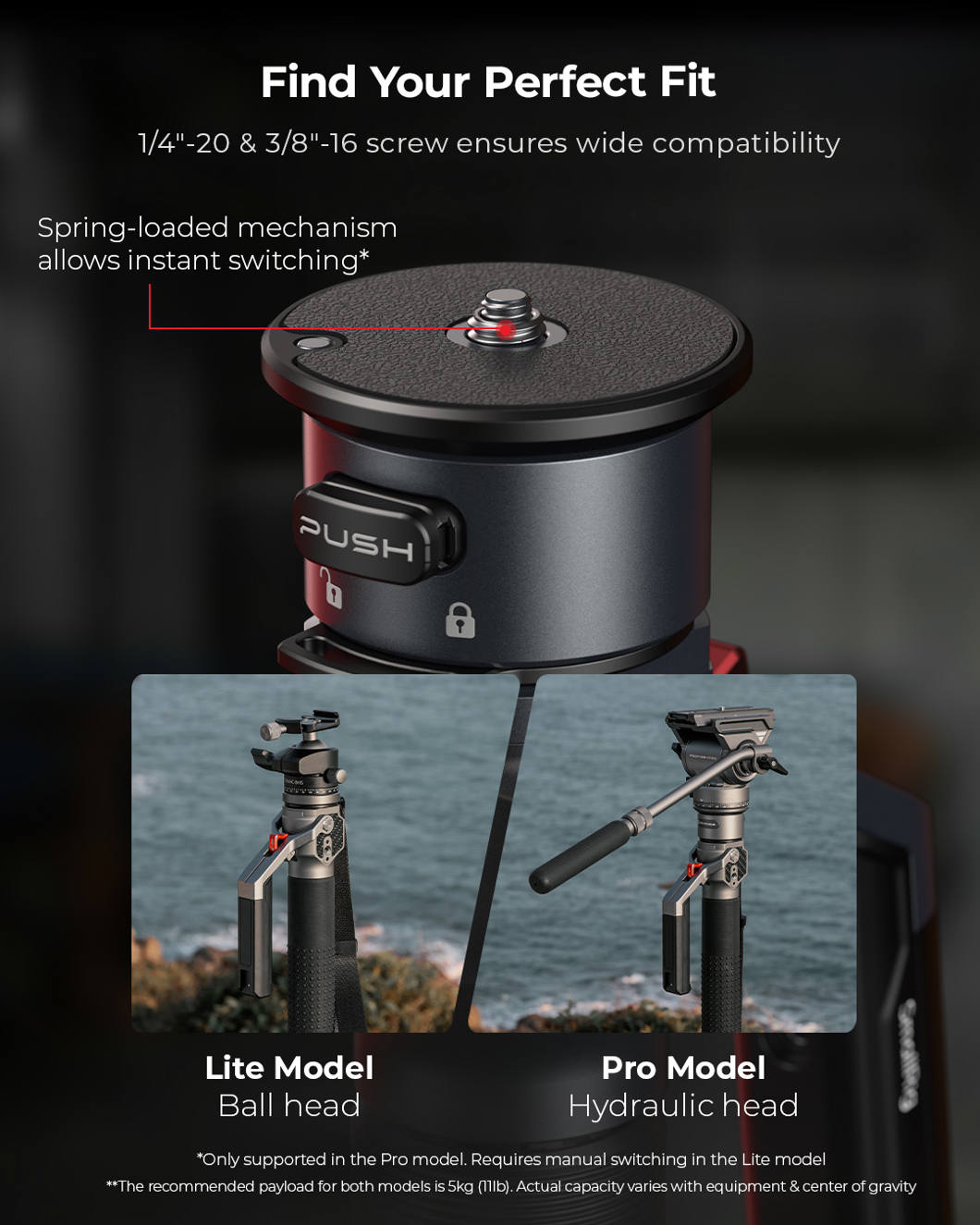 - Pää on yhteensopiva DSLR-kameroiden, peilittömien kameroiden, häkkien ja muiden 1/4"-20-kierteellä varustettujen laitteiden kanssa.