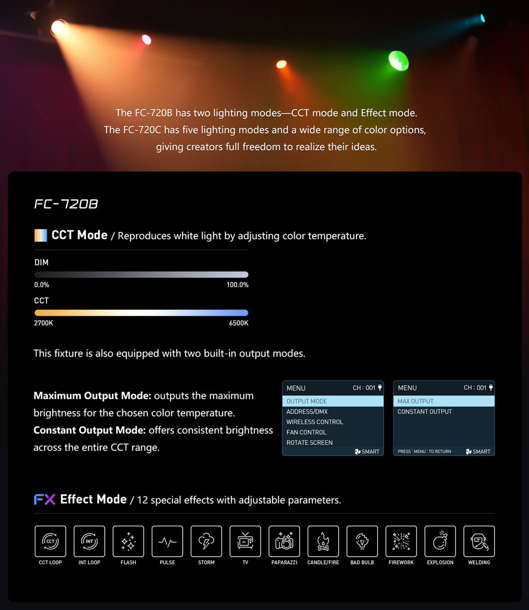 - Tilat: CCT, HSI, RGBW, Gel ja Effect