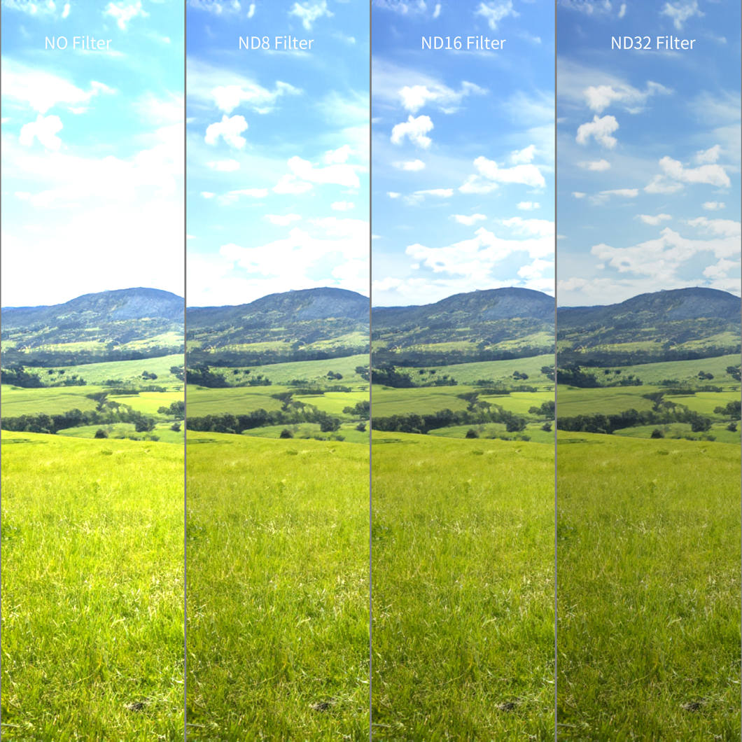 - ND32-suodatin sopii voimakkaisiin valo-olosuhteisiin tai luoviin pitkiin valotuksiin, kuten valojälkiin ja liikkeen hämärtymisefekteihin